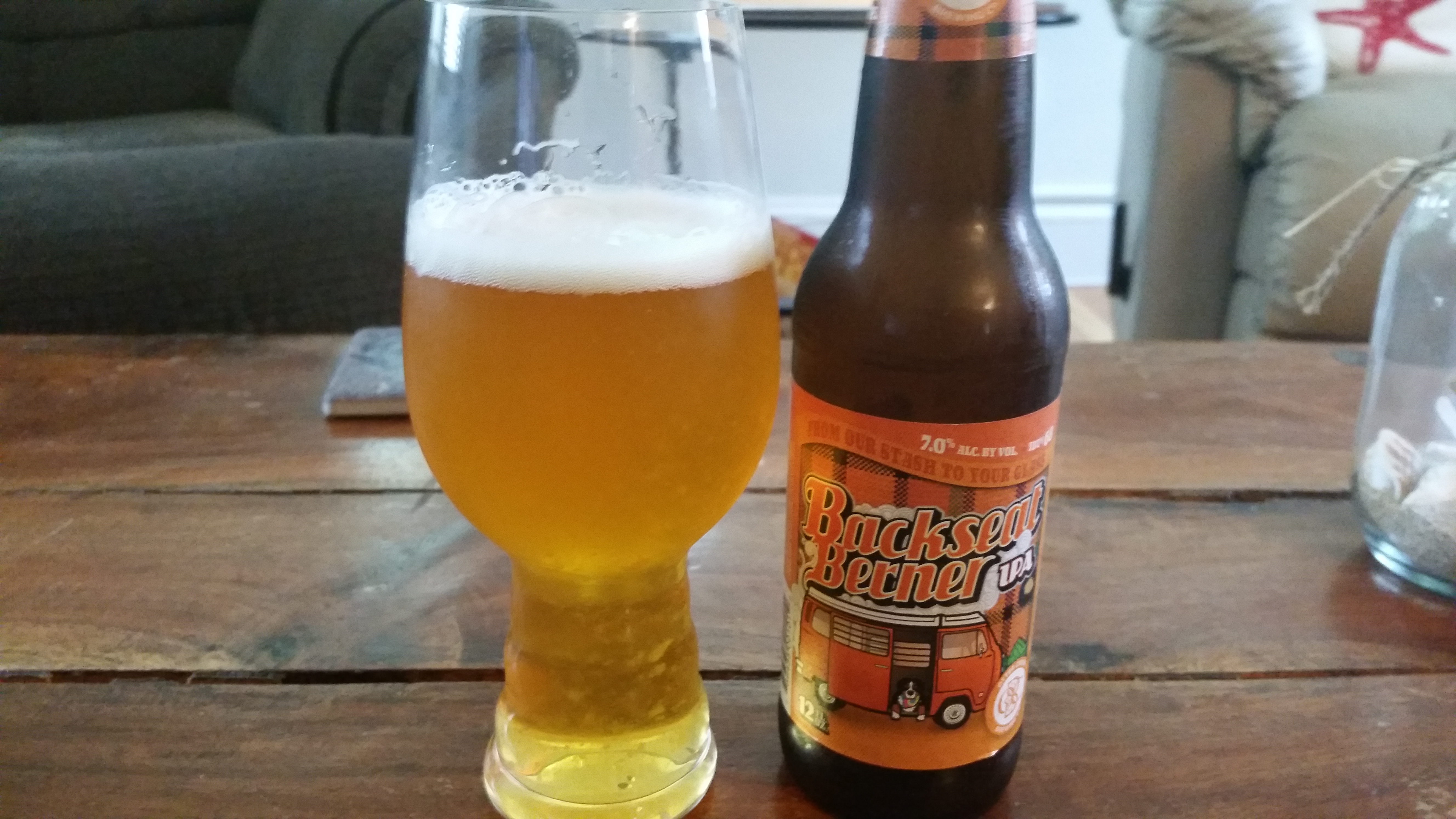 Otter Creek Backseat Berner pours a cloudy orange with a moderate white head. The scent is a solid dose of aromatic hops, citrus fruit and resin. The hops lead the flavor too, notes of grapefruit, lemon, cut grass, pine and nectarine. This hop flavor is accompanied by substantial but not overwhelming bitterness. While the beer is very hop-forward there is just enough malt to keep it from being overdone, touches of caramel and whole grains. Even with the full flavor and bitterness Backseat Berner drinks relatively easy, at 7% ABV it is not a light beer but not overwhelming either. The finish is classic American IPA, dry with some tongue-tingling bite. This is a quintessential West Coast style IPA, a showcase of New World hop flavor. Backseat Berner is a great addition to the strong Otter Creek line-up, and a good all-occasions IPA. Hoppy Boston score: 4.5/5.