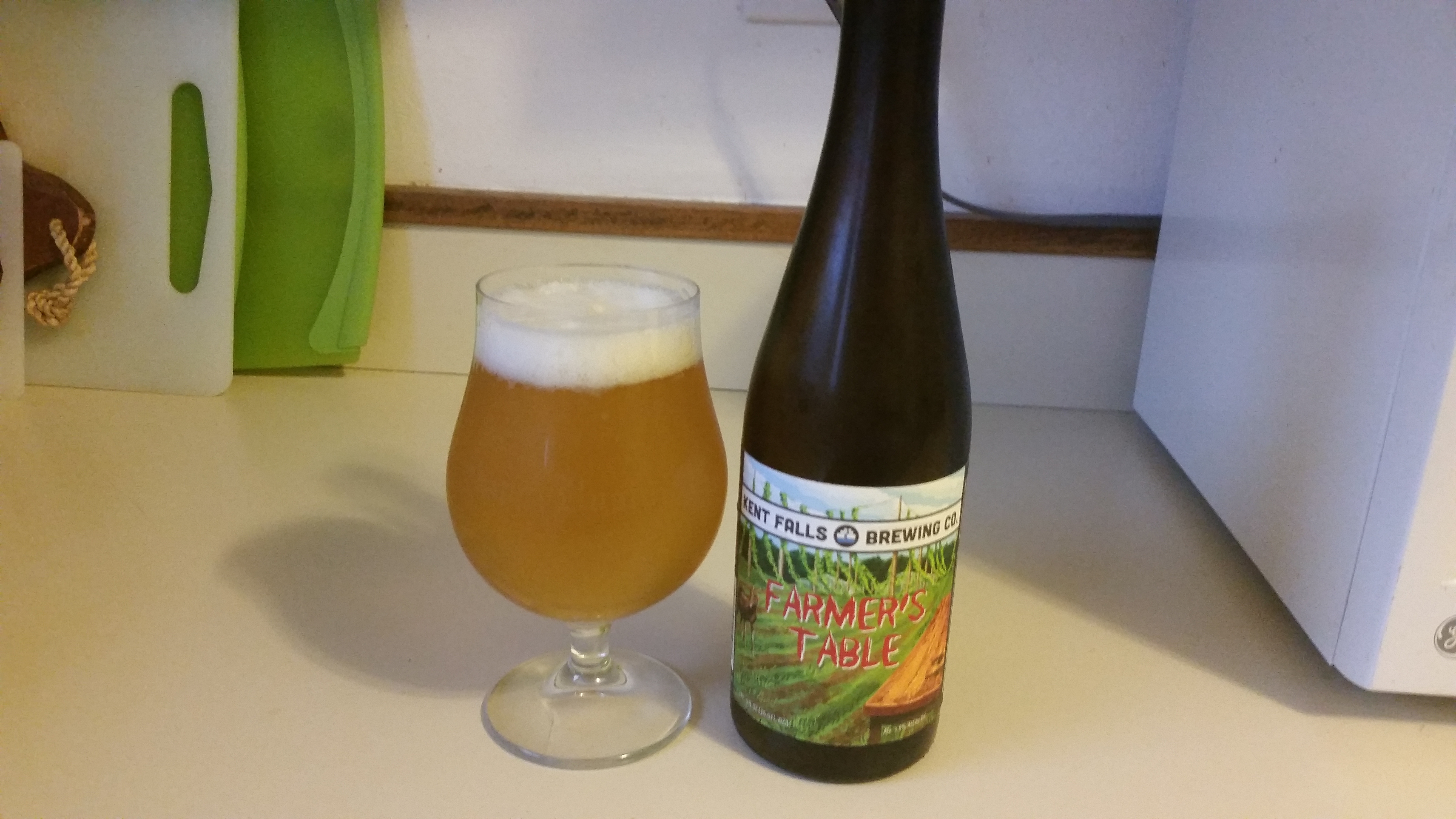 I mentioned on in my post on Monday that I took a trip to Connecticut this summer exclusively to pick up some of their local beers that aren’t distributed in Massachusetts. I sampled a number of great beers from breweries that I wasn’t very familiar with, and a couple definitely stood out. One of my personal favorites was Field Beer Saison #3 from Kent Falls Brewing Company, I love saisons and this one had the perfect mixture of complex flavor from a very expressive fermentation paired with easy drinkability. I was excited to learn, almost immediately after I sampled the beer, that Kent Falls was expanding distribution into Massachusetts. I’ve started to see a few of their beers around town, mostly on draft and now also in bottles. One that I tried recently was Farmer’s Table, a sessionable saison modeled after traditional Belgian table beers. These beers are designed to be low in alcohol with fruity and spicy yeast flavors that complement a variety of foods. You should be able to enjoy a few table beers during a long evening meal with friends and family. Kent Falls puts a little twist on the traditional style by dry hopping Farmer’s Table with hops from their on-site farm. Kent Falls Farmer’s Table is available on draft and in 16.9 oz. bottles.