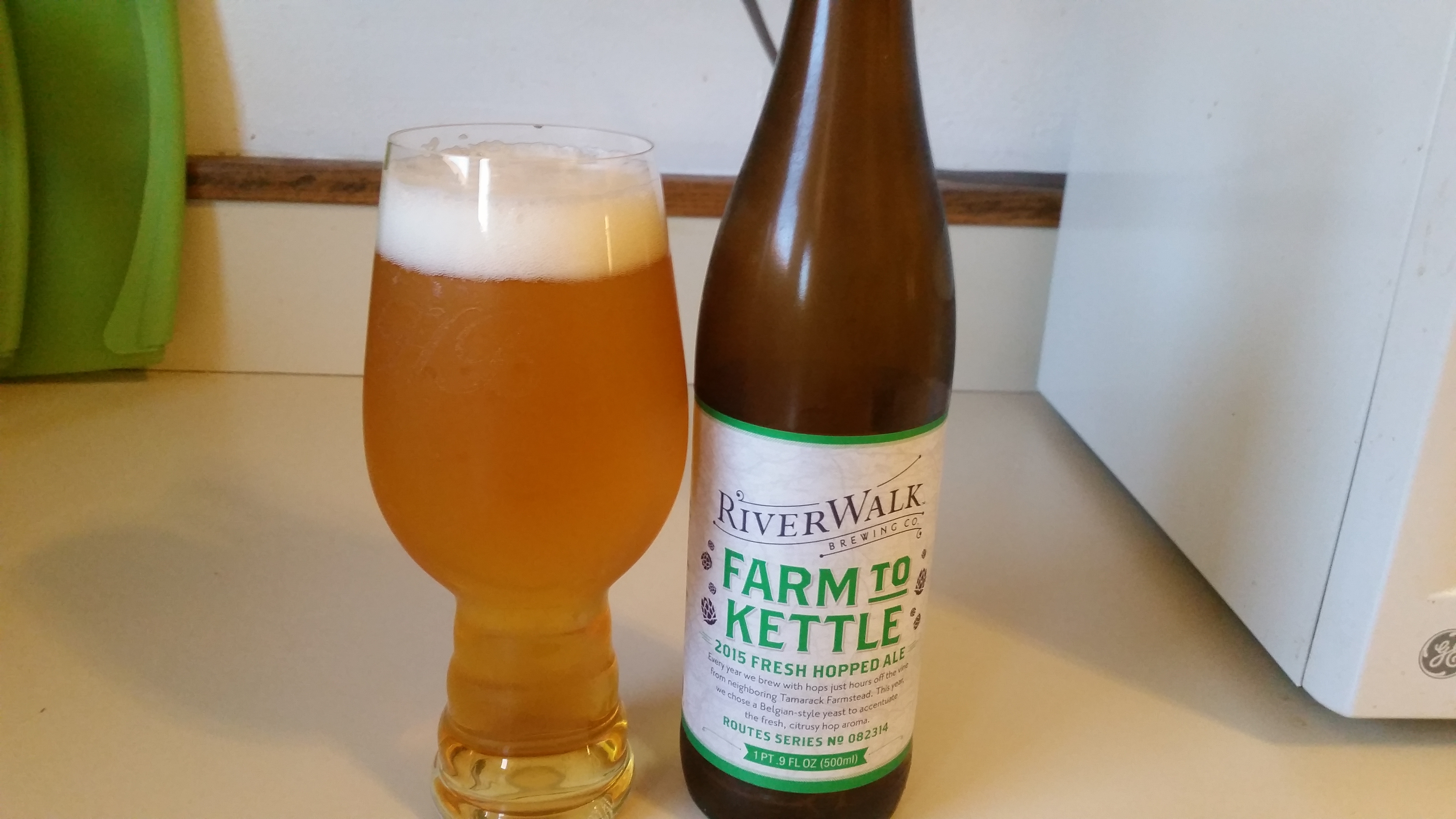 RiverWalk Farm to Kettle 2015 pours a clear golden yellow with a solid white head. The scent is a mixture of citrusy hops and fruity yeast. The fresh hops come through strongly in the flavor, notes of pine, grass and lemon along with an herbal quality that is distinct to freshly harvested hops. The hops also add a solid hit of bitterness. The Belgian style yeast forms a nice interplay with the hops adding touches of green apple, pepper and pear. The beer is rounded out with some light malts, hints of crackers and white bread. The beer is crisp and easy to drink, and moderately alcoholic at 6.5% ABV. Farm to Kettle finishes with a bitter kick and some lingering yeasty esters. I really enjoyed this beer, the combination of the Belgian style yeast and the fresh hops really work well together. Hoppy Boston score: 4.25/5.