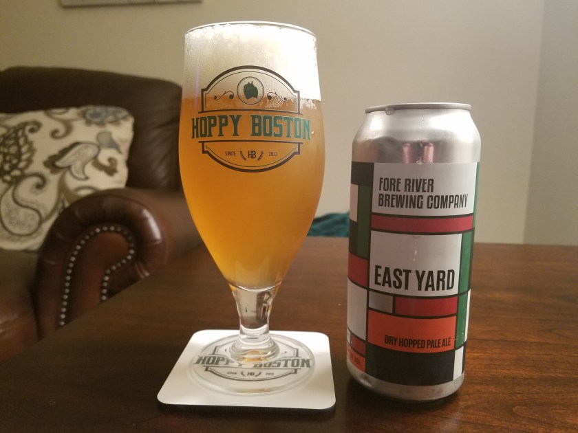 I often get asked about my excitement level when a regional brewery expands distribution into Massachusetts, and I am usually pretty indifferent. I focus almost all of my drinking on local beer (local to me means New England), so I haven’t even tried a beer from many new-to-the-area breweries like Toppling Goliath. The one exception is when a brewery from one of the other New England states moves into Massachusetts. I have trouble keeping up with every place in MA, let alone all of the breweries in the other five New England states, and I have limited travel time with my crazy work and family life, so the more New England beers available in Massachusetts the better. I have a solid list of breweries from throughout New England that I would love to see in my local bottle shops. A good example is Fore River Brewing in South Portland Maine. I make pretty regular trips to Maine but I never have time to visit every place I’d like to try, so it is nice to see more of the stellar beers from Vacationland make the trip south. Fore River has joined the Craft Collective lineup, one of the foremost craft distributors in the state, so their beers should pop up regularly on draft lists and in local bottle shops. One of the first beers from Fore River to make the trip south is East Yard Pale Ale, brewed with Mosaic and El Dorado hops and sold on draft and in 16 oz cans.
