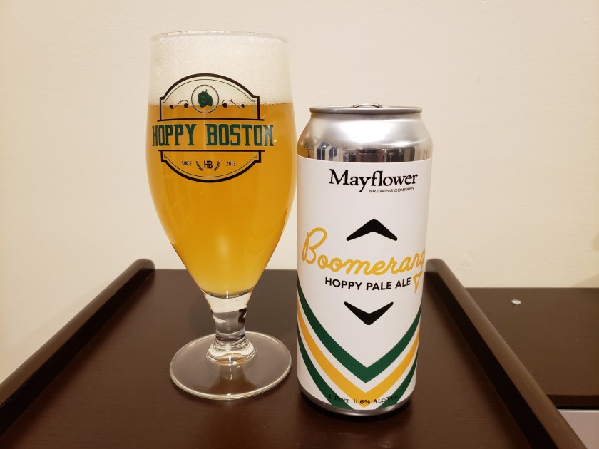 Mayflower Boomerang pours hazy deep yellow with a massive white head. The aroma showcases a solid dose of fruity hops. These hops lead the flavor, notes of pineapple, white grape and lemon-lime along with just a little bitter bite. The hops are complemented by a light malt backbone, hints of white bread and cereal. Boomerang is light bodied and very easy drinking, but not a session beer at 6.0% ABV. The finish is crisp with some lingering hop flavor. This is a very tasty APA, and that acronym could stand for American or Australian pale ale! Another very good addition to the Mayflower lineup. Hoppy Boston score: 4.5/5.