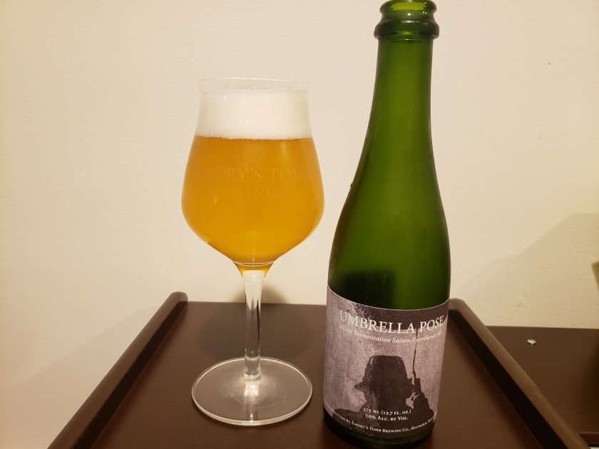 On Monday I posted a write-up on my recent visit to Amory’s Tomb, the Maynard establishment that specializes in saisons and other Belgian styles. The day before my visit Amory’s Tomb released three beers in bottles, all part of their barrel program. The importance of the barrels is obvious at Amory’s Tomb, a stack of full barrels is one of the first things you see as you walk into the taproom. After enjoying everything I tried on draft I was happy to grab a bottle of each release. One of the beers I bought was Umbrella Pose, a mixed fermentation farmhouse ale. They also released a version of the beer with blood oranges called Nineteen Animals. Amory’s Tomb Umbrella pose is available on a rotating basis in 375 mL bottles.
