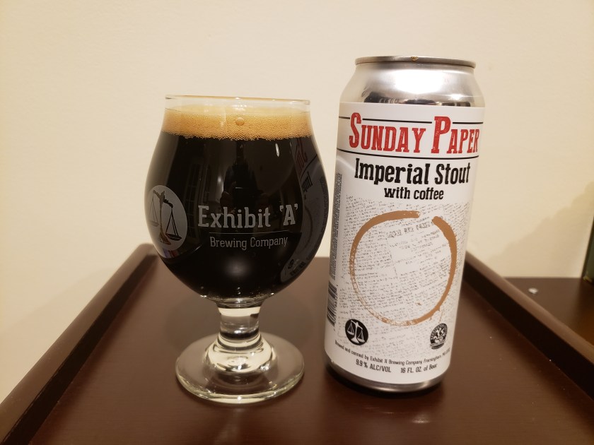 Last week I wrote an article about local beers that you should enjoy as replacements for some of the most popular releases from Founders Brewing. The obvious takeaway from the article was to support your local breweries instead of unrepentant racists, and this was clearly well-received, the article is already one of my most-read pieces of the year. The other message is that there is an amazing amount of awesome beer being brewed in this area, you can find multiple top-notch releases of nearly any style without too much effort. I know a certain segment of beer talking heads bemoans the ubiquitousness of NEIPAs in the region, but the majority of breweries make a range of interesting styles. My choice for a coffee stout was a beer I’ve enjoyed in the past but never formally reviewed, Sunday Paper from Exhibit A Brewing in Framingham. Sunday Paper is an imperial stout brewed with local roasted malt and coffee from Barrington Coffee Roasting Company, it is available on a rotating basis on draft and in 16 oz. cans.