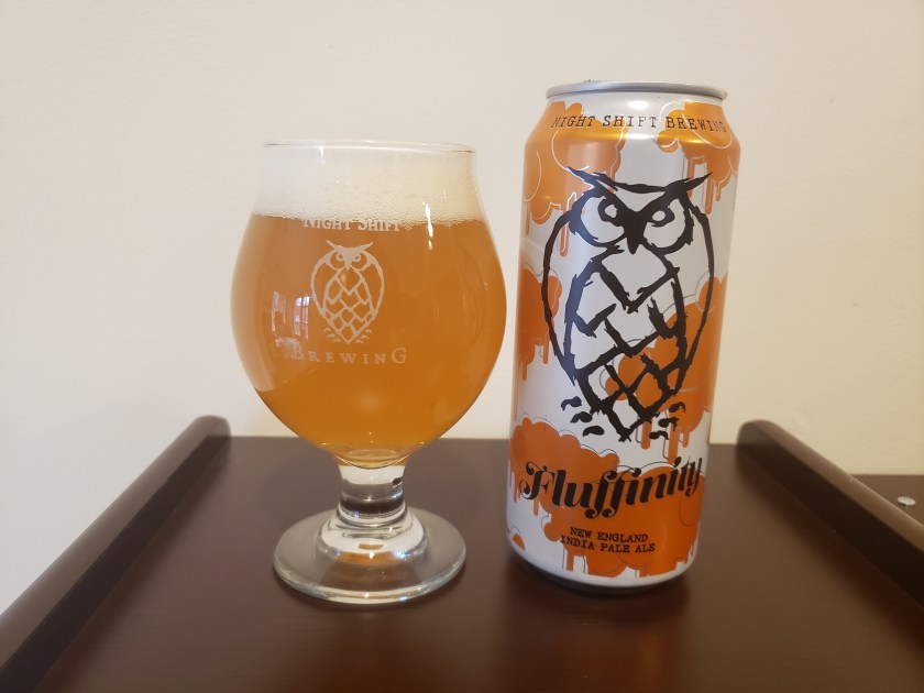 I’ve written a lot about the need for a brewery to find the right balance between their stable of core/flagship brands and the rotating/seasonal/one-off beers that keep the brand innovative and interesting. A good example of a brewery that has found this balance is Night Shift. Their core brands are all strong, led by hoppy beers like Whirlpool and Santilli along with lagers like Nite Lite and the new Nite Heavy. They also have a variety of seasonal favorites including their Weisse series of fruited sours and dark beers like Awake and Dynasty. Night Shift’s rotating beers can be all over the map, it usually features some diverse lager styles, occasional Belgian beers and sours, and always a bunch of different hoppy offerings. It makes a lot of sense to load up the rotating selections with hoppy beers, I think the haze fans tend to be the most promiscuous beer drinkers, and always want a new haze bomb to sample. Some of Night Shift’s experimental beers have morphed into more regular offerings, including their “Fluffy” series of NEIPAs. The newest release in the series is Fluffinity, a NEIPA brewed with Citra, Simcoe and Idaho 7 hops and available now in 16 oz cans.
