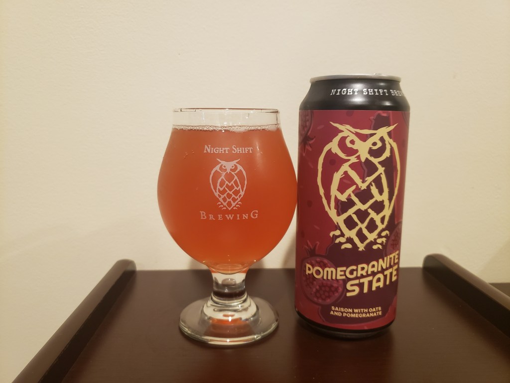 A year or two ago (I don’t remember exactly, it all seems to run together as you start to get old) I was having a Twitter chat with Night Shift brewer Isaac Boucher about our mutual disappointment that Night Shift had decided to not brew any saisons that spring/summer. Isaac and I both love the saison style, and I think many brewers and beer geeks agree, but the style does poorly on large scale, many saisons languish on shelves while IPAs, stouts and some sour styles move quickly. I was especially distressed that Night Shift wasn’t brewing Matisse, their stellar saison that was a staple of the rotation for a while. In a way I understand the issue, for many years I swore that I didn’t like Belgian style beers. While I was quick to embrace heavy doses of hops and rich roasted malt flavors, the yeasty esters were initially too foreign for my palate. The beer that changed my mind was Pretty Things Jack D’Or, and soon after I fell in love with both traditional and innovative takes on Belgian styles, especially saisons which are probably my second favorite beer style. Fortunately Isaac is still fighting the good fight, one of his newest recipes put into production at Night Shift is Pomegranate State, a saison brewed with oats and pomegranate. Night Shift Pomegranate State is available for a limited time on draft and in 16 oz cans, unless you all buy it out and convince breweries like Night Shift to keep brewing awesome saisons!