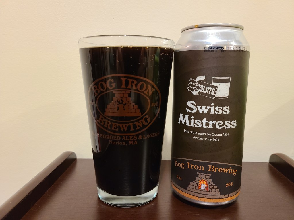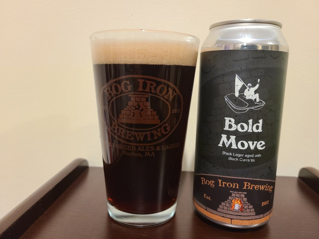 I’ve always enjoyed my visits to Bog Iron Brewing in Norton, excellent beer, great people, fun place to hang out or grab some beers to go, just a quintessential local brewery. A trip to visit had been long overdue for a while, my life is crazy with a demanding job and two young kiddos, so it is rare that I can take 2+ hours out of any day to swing a brewery visit, especially with the whole pandemic going on. Fortunately I built up some extra goodwill over the holidays and I was finally able to make the trip. It was a quick stop, I am still not drinking in bars and taprooms just grabbing beer to go, but I was able to stock my fridge with a wide range of awesome beers including a few that were new to me. Included in my haul was Bold Move a new-to-me dark lager with black currants, and Swiss Mistress, a milk stout with cocoa that I’ve enjoyed in the past but hadn’t had a chance to review. Both beers are available on a rotating basis on draft and in 16 oz cans.