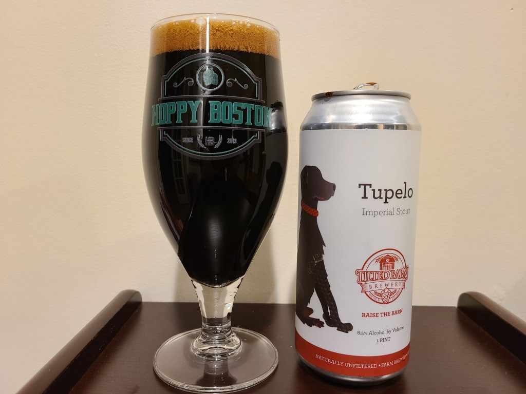 Rhode Island might be the smallest state in the union, but they have a vibrant and innovative craft beer scene. Established favorites like Proclamation, Foolproof and Grey Sail plus up and coming establishments like Long Live, Revival and Smug have put Rhode Island on the national radar. One brewery that has generated lots of hype is Tilted Barn Brewing in Exeter, they were even the subject of a lengthy profile in a national beer magazine. Tilted Barn specializes in IPAs, which should come as no surprise since I used the word “hype”, but they also make a smattering of other styles including sours, saisons and stouts. Under normal circumstances the only way you would find Tilted Barn beer would be by taking the drive to Rhode Island, but the COVID-19 pandemic has forced many breweries to adapt their business models. This is especially true for Rhode Island breweries since the state has obscenely strict limits on how much beer they can sell directly to consumers (although there has recently been some positive progress towards changing those laws). Many Massachusetts beer fans were pleasantly surprised when Tilted Barn beers started popping up in local bottle shops earlier this year. While the beers sell quickly, I was able to get my hands on some Tupelo, Tilted Barn’s imperial stout. Tupelo is named after the loyal and sweet brewery/farm doggy, and is available on a rotating basis on draft and in 16 oz cans.